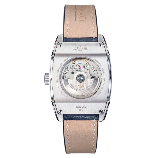 Despite all these reminiscences of times gone by, the remaining features of the DAVOSA Evo 1908 prove that it is a modern, exclusive timepiece. The Swiss SW260 movement is an unusual variation of the 3-hand automatic with date display. The striking Arabic figures, indices and the date at 3 o’clock are easily readable at a glance. The back of the 12 mm-high case is screwed down fourfold and is water resistant to 50 m (5 ATM). Moreover, the Vintage leather straps with a pin buckle are all one of a kind: the leather is individually selected and colour-coordinated to suit each dial version.
