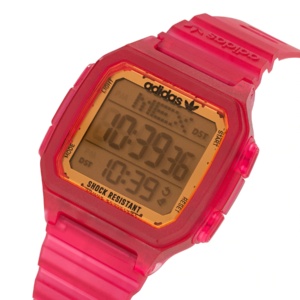 Utilitarian design for the urban traveller that keeps on time anywhere in the world. The shock-resistant case of this adidas Originals Digital One GMT watch easily adapts to the lifestyle of the modern explorer, while World Time technology provides the time zone in 85 key cities around the world.