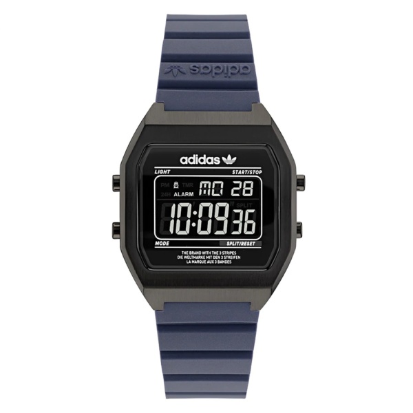 An 80’s retro digital vibe coming straight from adidas Originals’ rich archive and combined with modern flair. Either with a stainless steel bracelet or a coloured resin strap, the Digital Two watch is a fun accessory with serious timekeeping features including time and date display, alarm and chronograph functions.