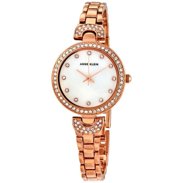 Mother of pearl dial with rose gold-tone hands and crystal hour markers