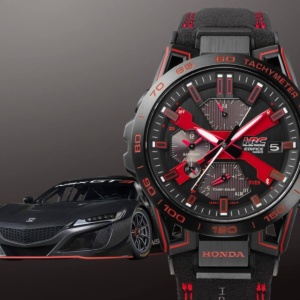 EDIFICE meets Honda in this special-edition timepiece featuring the same genuine paint used for the red Honda badge. This iconic badge, a symbol of Honda racing spirit, appears exclusively on Honda race cars like the RA271 and on the speedy Type R editions of their commercial cars. The authentic red paint is used for the X at the center of the EDIFICE dial.
