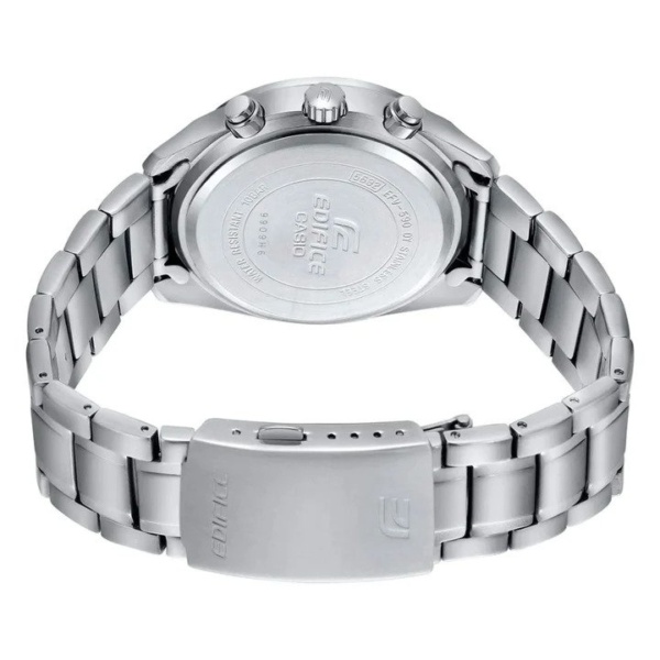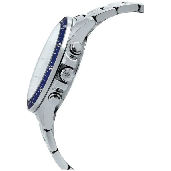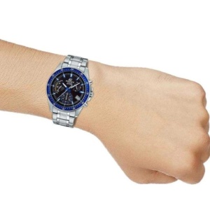 A mid-size standard EDIFICE chronograph. Parts of the bezel, hands, indices, and inset dial have a blue coloring to create a sporty design.