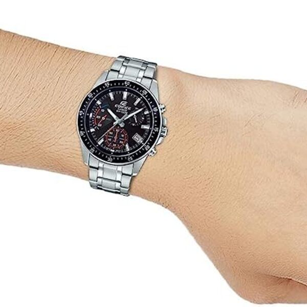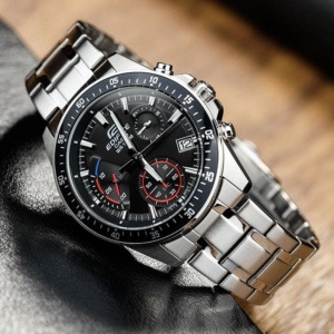 A mid-size standard EDIFICE chronograph. Parts of the dial are finished in red and blue accent coloring to create a tight, sporty design.