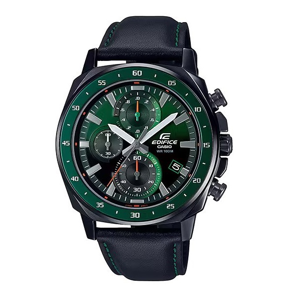 A mid-size standard EDIFICE chronograph. A design inspired by the green laser lights used during night races. The case and band have a black ion plate finish that resists scratching. Uses a genuine leather band.