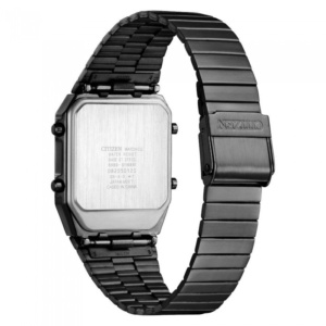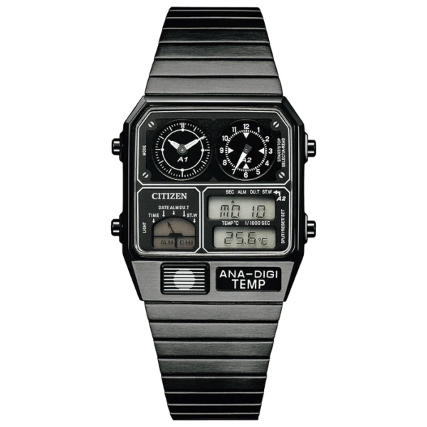 Inspired by an original Citizen analog-digital watch from the 1980s, this black stainless steel rectangular case watch is packed with features, including dual time and subdials. This battery-operated timepiece also includes an alarm, the digital time, and the temperature, making it a unique and stand-out timepiece.
