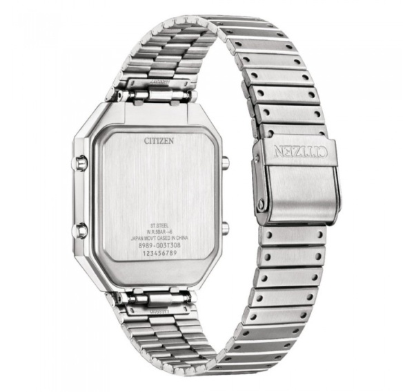 Inspired by an original Citizen analog-digital watch from the 1980s, this stainless steel rectangular case watch is packed with features, including dual time and subdials. This battery-operated timepiece also includes an alarm, the digital time, and the temperature, making it a unique and stand-out timepiece.