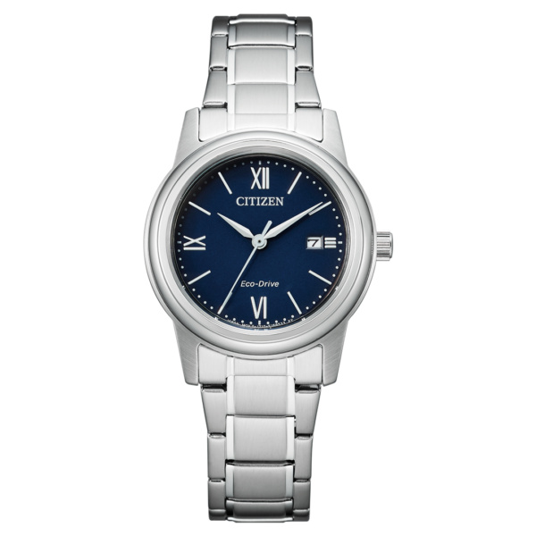 Simple and elegant women’s dress style watch characterised by a simple and clean design, the band is brushed stainless steel bracelet surrounding a 30mm stainless steel case and a blue dial finish providing an elegant touch. Featuring 3 hands, date display and a mineral crystal glass. Water resistant up to 100 metres equipped with Eco-Drive technology powered by any form of light.