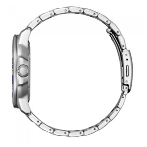 This sophisticated watch is equipped with Eco-Drive technology powered by any form of light and no frequent change of batteries needed, storing up to 8 months power in reserve for next level reliability. Featuring a blue dial with date display, luminescent markings, black and blue toned bezel and silver band and case, it is a benchmark in refined style. Completed by a host of engaging features including water resistance up to 100 metres, low charge indicator, push button buckle for comfort and accuracy to within 15 seconds per month, it steps up when dependability counts.