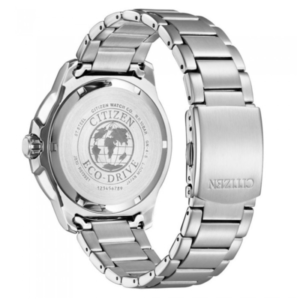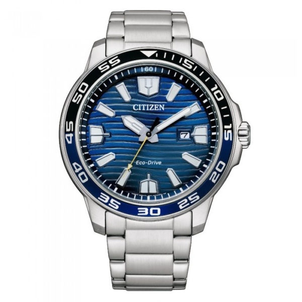 This sophisticated watch is equipped with Eco-Drive technology powered by any form of light and no frequent change of batteries needed, storing up to 8 months power in reserve for next level reliability. Featuring a blue dial with date display, luminescent markings, black and blue toned bezel and silver band and case, it is a benchmark in refined style. Completed by a host of engaging features including water resistance up to 100 metres, low charge indicator, push button buckle for comfort and accuracy to within 15 seconds per month, it steps up when dependability counts.