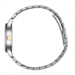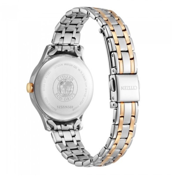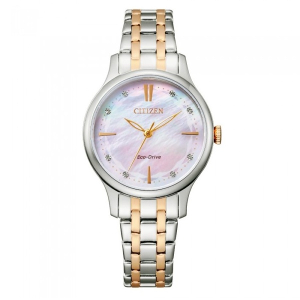 A contemporary Eco-Drive lady timepiece with a chic design that will fit your style from day to night. Featured in two-toned rose gold stainless steel bracelet with pink mother of pearl dial. This striking accessory adds feminity to any occasion. Crystals are crafted on the dial to add a touch femininity to this classic accessory. Powered by Eco-Drive technology, no need for regular battery replacement.