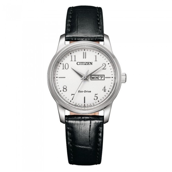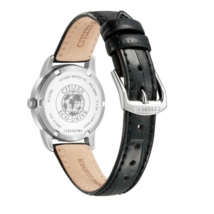 This Eco-Drive lady watch offering precision that enables accuracy to within 15 seconds throughout the month, is generated by Eco-Drive, harnessing the energy of light to provide an environmentally friendly and convenient alternative to batteries. Featuring a white dial with day/date display and easily observed markings, it is built from stainless steel and black calf leather.