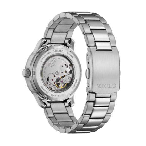The luminous hands and markers of the NJ0191-83A provide easy readability, and the date display at the 3 o’clock position adds practical functionality. Designed for durability, the watch is water-resistant up to 10 BAR (100 meters). The stainless steel bracelet is equipped with a fold-over clasp and safety release for a secure fit, and the mineral crystal offers features for long-lasting performance. Perfect for any occasion, this Citizen automatic watch combines style, functionality, and reliability.