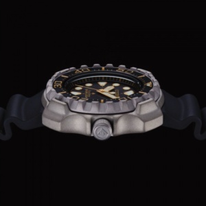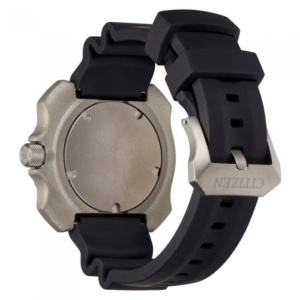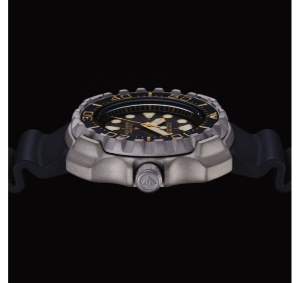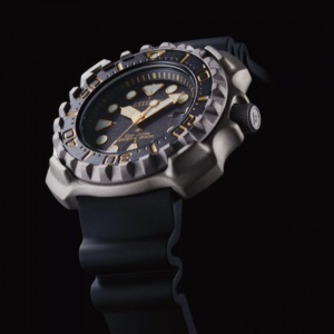 Citizen PROMASTER Eco-Drive Diver 200m inspired by CITIZEN’s iconic 1982 Professional Diver watch with pressure resistance up to 1,300 meters – at the time of its release. The lug-free case silhouette, the four bezel guards, and the large indentations on the rotating bezel gave the watch a bold, distinctive look. The rounded, chunky shape of the case combines with the striking indentations on the bezel to create a tough, sporty look. These timepiece feature a sandblasted finish with its titanium grey color features a Super Titanium™ case with Duratect MRK, and the dial and the color scheme are reminiscent of the original 1982 design. It enhanced visibility of the hands and bezel, providing a more refined interpretation of the original bold design. The 46.5mm case is the same size as the original, but the case thickness has been reduced slightly to improve the fit. These light powered Eco-Drive watches do not require regular battery replacement, and feature ISO compliant water resistance to 200 meters.