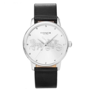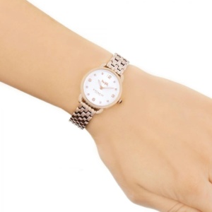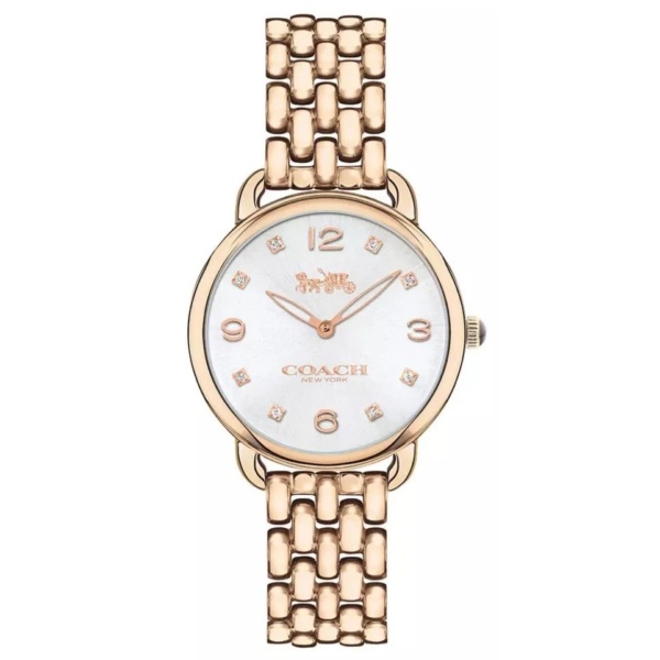 The Coach Delancey watch for women features a sleek rose gold steel strap and a classic white dial. With its timeless design and durable materials, this watch combines fashion and functionality for a stylish accessory that will last. Perfect for any occasion, add a touch of elegance to your wardrobe with this timepiece.