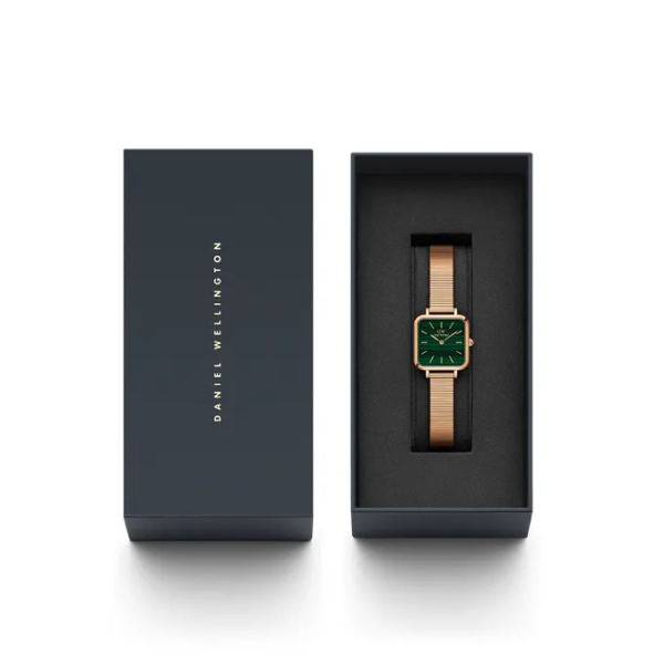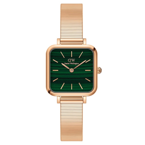 The Quadro Studio features a delicate and petite, green-patterned square dial, complemented by the sleek Piano strap. Crafted with polished stainless steel and available in a refined rose gold plating. A retro statement with timeless appeal.