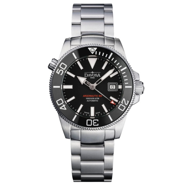 The Swiss DAV 3021 automatic movement in its screwed stainless steel case keeps perfect time on the way down. Scratch-resistant, anti-glare sapphire crystal guarantees a clear view of the tidily designed dial with its 15-minute scale on the bezel inlay to provide orientation in an emergency ascent. And thanks to the extension to the stainless steel strap with a safety clasp, the DAVOSA Argonautic BG Automatic can be easily worn on top of a wetsuit. The state-of-the-art Super-LumiNova BG W9 luminous pigment ensures exceptional luminous properties. This material has been applied to the figures and hands, and now for the first time to the 15-minute scale and all the figures on the ceramic bezel. Under natural light, this best-in-class luminous pigment appears white; in the dark it shines brightly and clearly in clear blue. Thanks to a manual helium escape valve, a controlled equalisation of pressure inside the watch can be achieved when ascending to the surface. Moreover, the valve at 10 o’clock has been technically optimised and is now clearly identifiable thanks to the helium symbol on the crown face.