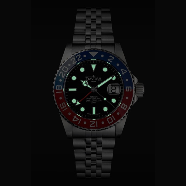 In the GMT version, a 24-hour display, the distinguishing feature of the second time zone, is displayed prominently on a rotatable diving bezel, giving the Ternos its characteristic sporty yet functional appearance. The coloured bezel inlay is made of high-tech ceramic and is extremely scratch-resistant with a hardness (according to Vickers) of 1250 HV. It is also heat and corrosion-resistant, and proffers a fine feel thanks to a high-gloss polish. The production of these ceramic bezels is very elaborate; a great deal of expertise is required to produce the different colours in a consistent quality and colour brilliance. Until now, DAVOSA has offered the Ternos Professional GMT in a monochrome black version and in combination with a brilliant blue, but fans of the brand requested additional options. After more than 12 months of development, DAVOSA has now succeeded in producing a deep red, high-tech ceramic that contrasts superbly with black or dark blue, and yet forms a lasting unit with the dark nuances. The scale of the 24-hour display, which consists of a triangle, Arabic numerals and dots, is then engraved into the bezel by a high-precision laser before being filled with the contrasting colour. This creates two new variants of the Ternos Professional GMT TT in red-blue and red-black. At DAVOSA, the appendix TT stands for ‘two-tone’.