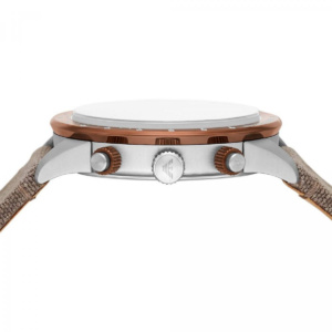 43mm watch featuring a sunray silver dial with IP copper top ring with white marking. Matte copper indexes with white luminova, quartz movement with chronograph and grey fabric strap.
