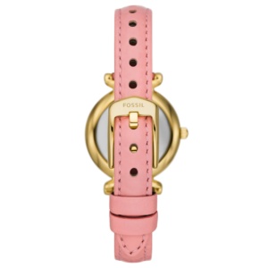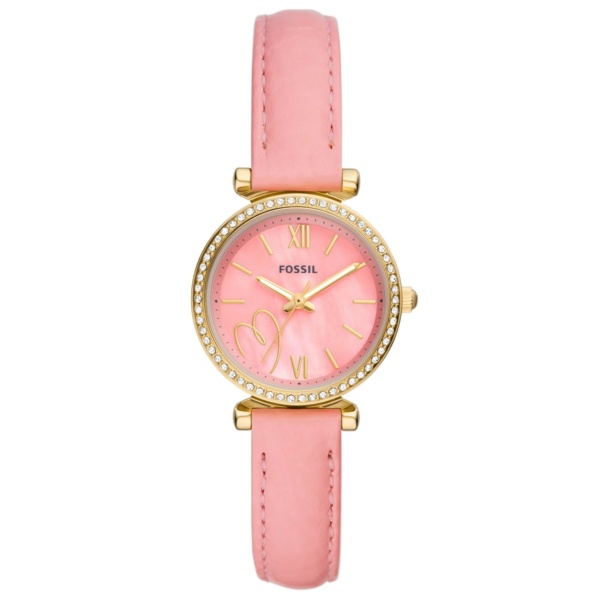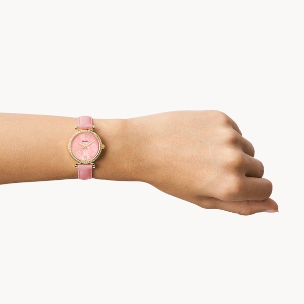 This 28mm Carlie features a pink mother of pearl dial, three-hand movement and pink eco leather strap.