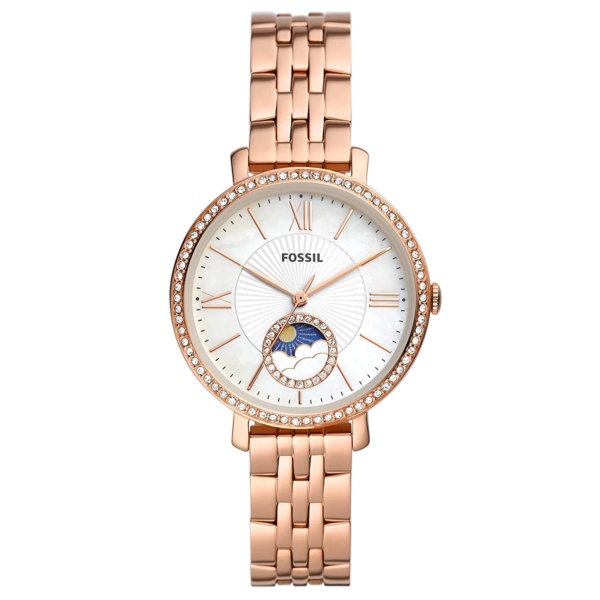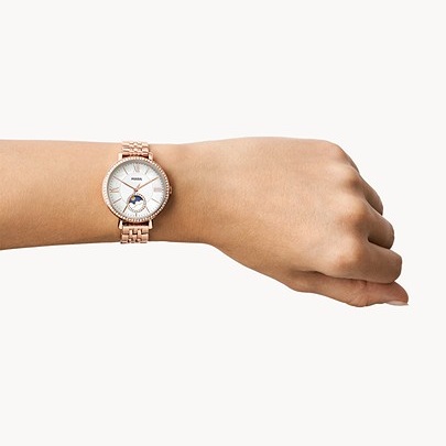 This 36mm Jacqueline Multifunction features a white mother of pearl dial with a sun and moon window, three-hand movement and a rose gold stainless steel bracelet.