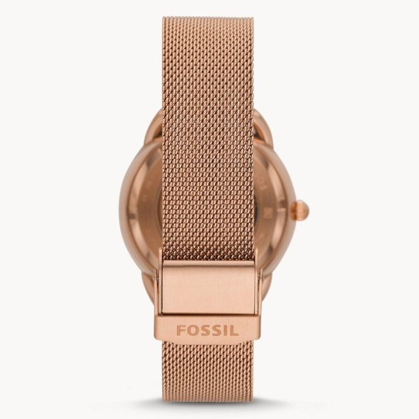 Gorgeous inside and out, this new Tailor’s automatic watch from the House of Fossil reveals its inner-working mechanism when worn on your wrist. A clear window into the mechanical gears gives a ‘Floral Deco’ touch to this Fossil automatic watch. Giving you up-to-the-minute innovation, this chic watch features a refined rose-gold case, housing a see-through matching skeleton dial, three-hand movement, dot indices and a rose-gold mesh stainless steel bracelet, which holds the whole piece together.