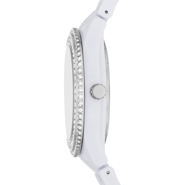 Rings of pavé-set crystals encircle a multifunction bracelet watch made from bio-based castor oil that beautifully blends utility and elegance.