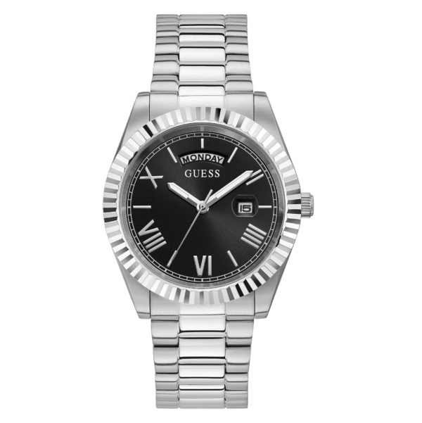 A classic look that never gets old. This coin edge bezel is integrated with a brushed and polished 3 link bracelet and featured a day of the week window at the 12 o’clock hour with a bubble date at the 3 o’clock.