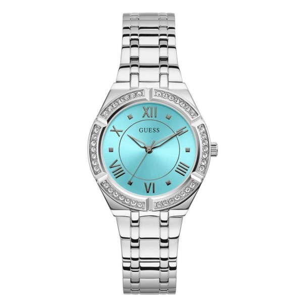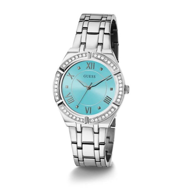 Classic with a modern twist, our Silver Cosmo Aqua Crystal Watch is a must-have. Crafted from a stainless steel material, this watch features a silver tone case, aqua blue dial colour, crystal case bezel, a pilot buckle closure and an analog watch face. Perfect for taking your look from day to night this season in style.