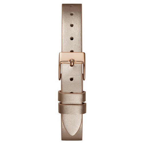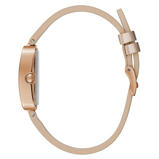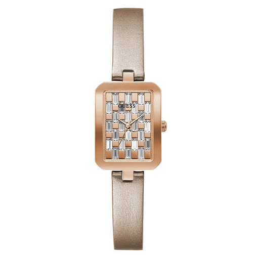 The Guess ladies bauble watch features a 22mm rose gold tone case with a baguette encrusted glitz dial and a metallic nude genuine leather strap.