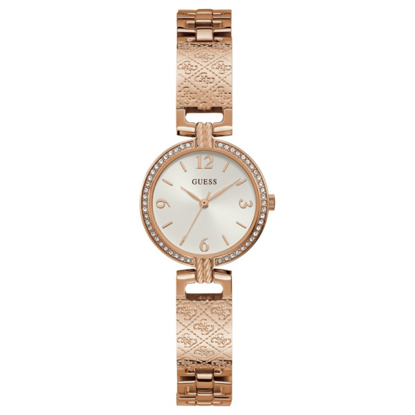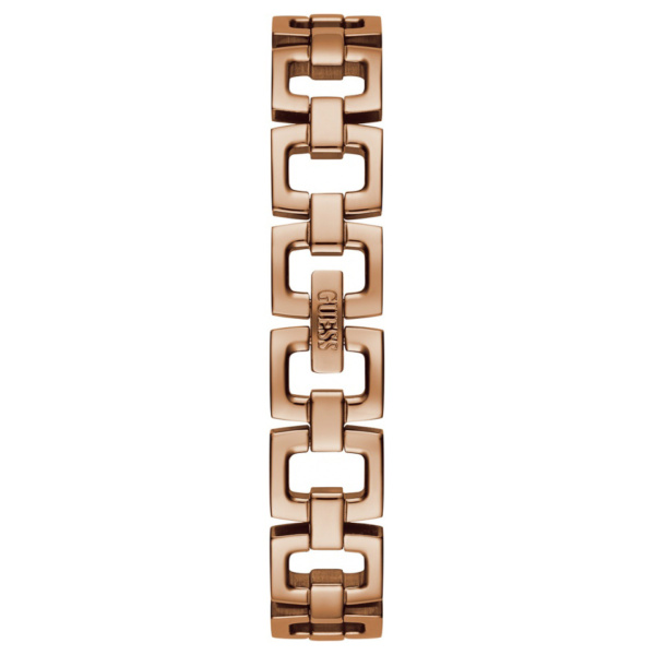 The Mini Luxe GW0112L3 features a rose gold stainless steel bracelet strap with rose gold stainless steel case and a white dial with rose gold Arabic and baton indices.