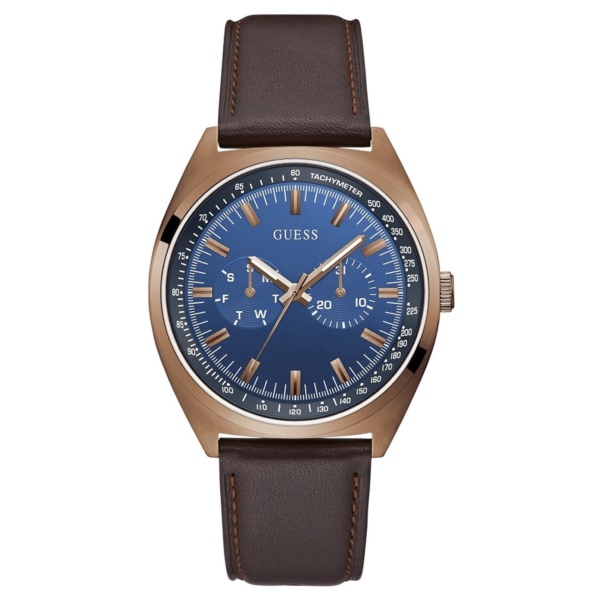 This gents Blazer watch has a round blue dial with rose gold markers, rose gold tone case on a brown leather strap.
