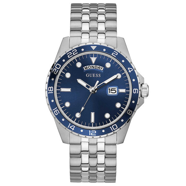 The perfect addition for any wardrobe. This hybrid sport and dress watch features a day date function on a five link stainless steel bracelet with a blue dial.
