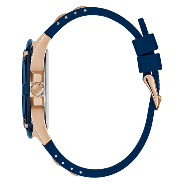 This timepiece features a chrono-look multi-function on a rose gold-tone steel case with a blue top ring. The comfort of the blue silicone band features rose gold-tone stainless steel inserts giving you the comfort of silicone with the look of a bracelet.
