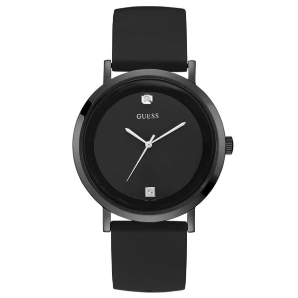 Black dial enhanced by silver-tone hands. stainless steel case with a black silicone band. Quartz movement. 30 meters / 100 feet water resistance. Fixed bezel. Scratch Resistant Mineral crystal. Solid caseback. Buckle clasp. Pull / Push crown. Case size 44 mm x 9 mm. Guess W1264G2 Supernova Watch.