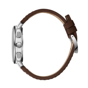 Round Super Metal Silver Case With Multi Function Display, Green Dial 42 mm Case Diameter, 5 ATM Water Resistant Brown Leather Bracelet With Tang Buckle.