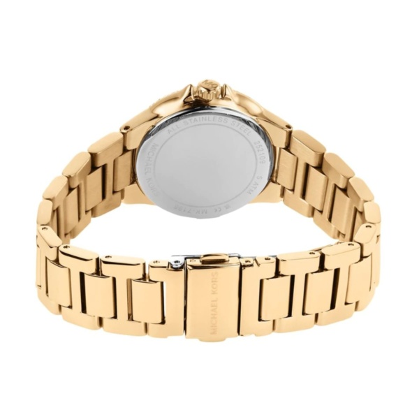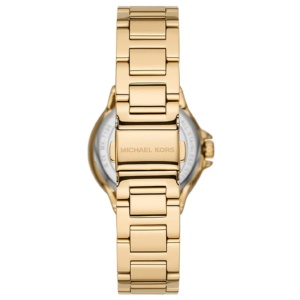Michael Kors’ 33mm Camille watch features a crimson pavé logo dial, gold-tone case with a pavé topring, three-hand movement and gold-tone stainless steel bracelet.