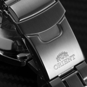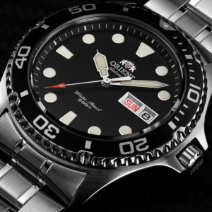 This best-selling ORIENT 41.5mm mechanical sports watch showcases a slim case design, suitable for business and outdoor adventures. The stylish and sporty timepiece features a stainless steel case and band, black dial, and screw-down crown to maximize water resistance. The watch also includes a black unidirectional rotating bezel with enlarged numbers for simple tracking, silver hands with luminous accents, a convenient date aperture, and easily visible white hour markers. With a water resistance of 200 meters, the AA02004B is excellent for skin diving.