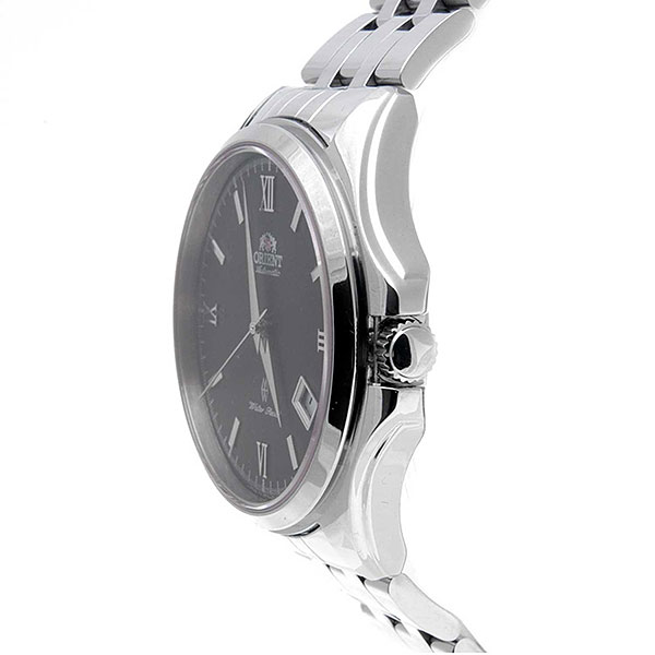 Business men’s wristwatch in a polished steel round case on a comfortable polished steel bracelet. Black dial.