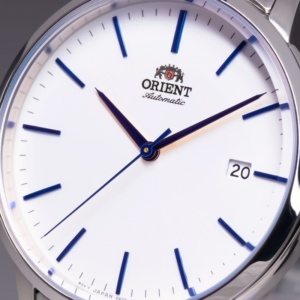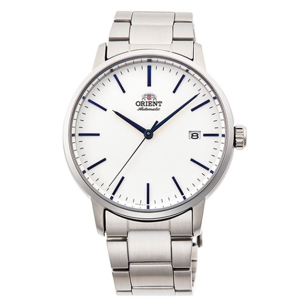 This contemporary ORIENT 40.0mm mechanical watch showcases a stainless steel case and band with a stylish white dial. Complementing its sophisticated design are a convenient date aperture, attractive blue hands and hour markers and a hand-wound crown with automatic self-winding functionality. The RA-AC0E02S supports continuous running time of 40 hours and water resistance of 100 meters.