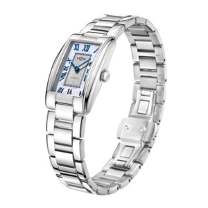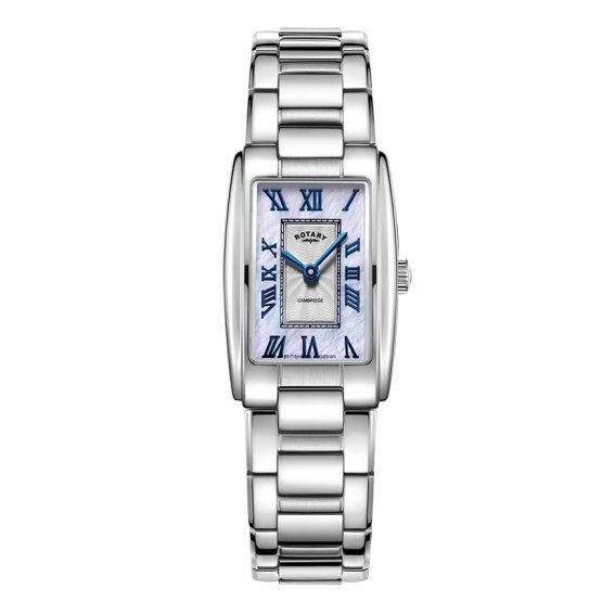With its 21.5 x 33mm stainless steel case, this Cambridge makes for a sophisticated dress watch. Powered by a quartz movement, the timepiece features a white mother of pearl outer dial and guilloche inner dial. Blue Roman numeral hour markers and hands are protected by sapphire glass. With an h-link stainless steel bracelet, this watch is also water resistant to 50m.