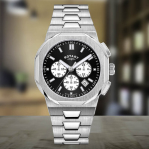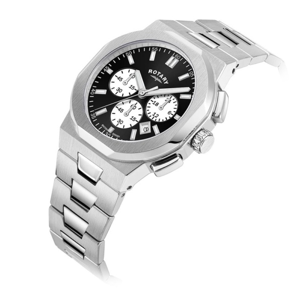 This Rotary Contemporary watch is crafted with a multi-facetted brushed stainless steel 40mm case and tapered h-link bracelet. The watch showcases a black sunray dial that features its chronograph function, luminous applied hour markers and a date window. Water resistant to 100m, powered by a highly reliable quartz movement.