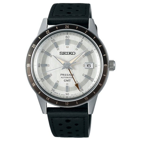 The essence of the Seiko Presage Style 60s collection is vintage style, which continues with the ‘road trip’ theme of this model, inspired by the iconic 1960s cars; their wheels, levers and instruments and colour scheme. Its hairline finishing gives it a machine-like feel, whilst the new GMT dial layout incorporates the details of the original Seiko 1964 crown chronograph.