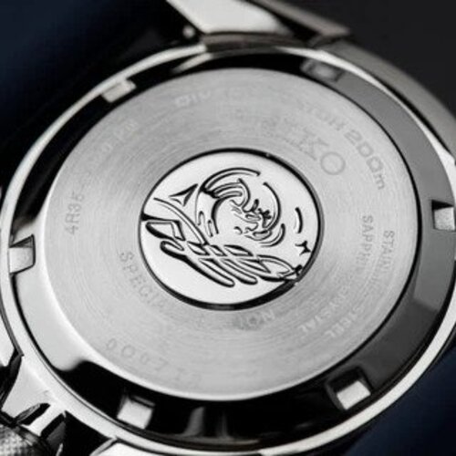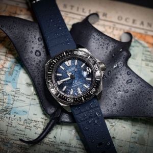 This Prospex watch is from Seiko’s “Save The Ocean” collection. The dial of this special edition timepiece represents the view of the ocean as seen by the 5m deep vision of the Manta Ray endangered species. Its colours echo the gradations of sunlight refraction and the patterns symbolise waves seen from under the sea. Seiko donates proceeds from Save The Ocean models to sea conservation organisations.