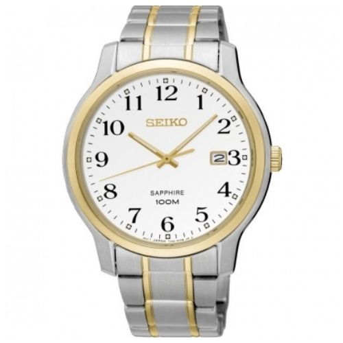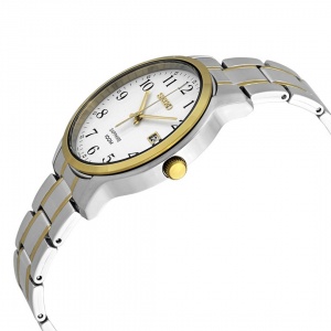Elegant design throughout, two-tone bracelet with white dial and arabic number hour markers.PVD gold plate and polished titanium case for a touch of classDate display at the 3 o’clock position. Sapphire glass is perfect to survive the stresses of daily life. Highly scratch resistant, Sapphire crystal is measured at 9H on Mohs Hardness Scale, able to resist scratches from all but Diamond.