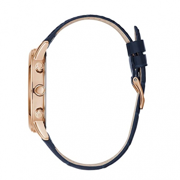 There is nothing not to love. Fabulous aesthetic and multifunction, you can wear this watch daily. Dress and impress. A day, date and 24 hour sub-dial feature, controlled by some chic crowns and finished in blue with rosegold accents complimenting beautifully. A leather strap completes the look with reptile markings, giving a trendy edge.